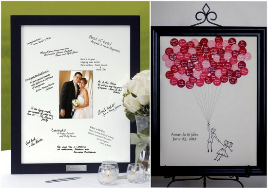 Uma foto bem bonita dos noivos e espaço para escrever em volta. Um quadro de assinaturas é perfeito pra quem quer pendurar a lembrança do casamento na parede da sala.