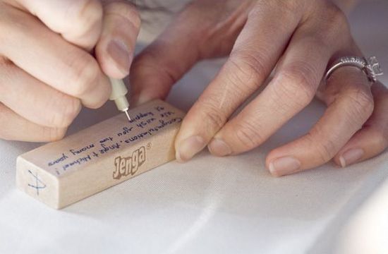 Para quem gosta de jogos, uma boa aposta é utilizar peças de jenga para gravar os recados. Os convidados deixam a mensagem e todas as vezes que o casal jogar, tem a lembrança do casamento.