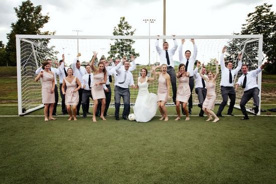 Outra ideia é tirar fotos legais com o noivo e os padrinhos em um campo de futebol, ou pelo menos com uma bola.